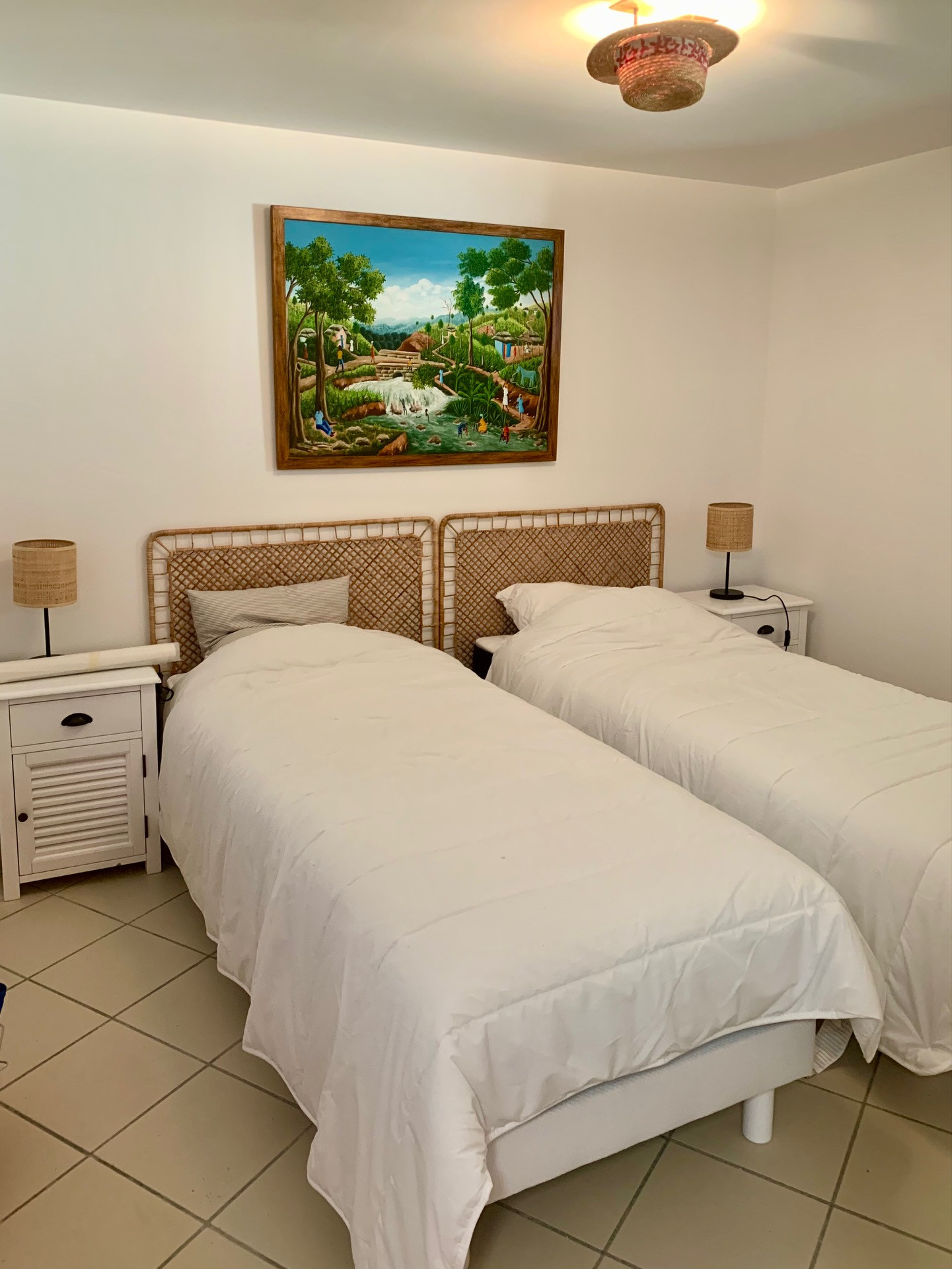 Deux chambres avec lit de 160cm, 1 salle de bain avec baignoire + douche, 1 vasque .